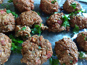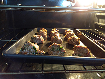 Step 4- Mix all the ingredients together and add more breadcrumbs until the desired consitency, easy to ball up. Ball up into about 1.5 inch balls
